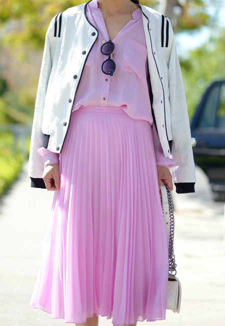 Еще одна альтернатива традиционной одежде горожан, как например, джинсов с рубашками или офисных костюмов - бомбер в дуэте с юбкой-трапецией в цветовой гамме total look. Разбавить однотонный наряд можно с помощью большой, яркой и вместительной сумки или массивных украшений.