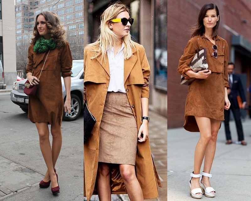 Замшевая юбка нюдового оттенка отлично будет гармонировать с блузкой, водолазкой или теплым шерстяным либо кашемировым гольфом нейтральных цветов. Замшевые куртки и тренчи разумеется, больше подходят для осени и весны, чем для сезона зимних холодов. Их можно сочетать с джинсами-бойфрендами, а также рваными джинсами, брюками-клеш, юбками-плиссе и обтягивающими штанами. В общем, практически с любой вещью из твоего гардероба, если для завершения лука подобрать правильные обувь, сумку и аксессуары. Если ты купила себе новые замшевые ботильоны, то совсем необязательно бежать в магазин в поисках замшевой сумки, один материал, из которого сделаны аксессуары – это немного устаревшее понятие, так что смело решайся на новые эксперименты! Кстати, рюкзаки из замши – вот, что действительно круто, а если они к тому же будут декорированы бахромой, то цены им не будет! Еще один безусловный musthave – это замшевая жилетка. Джинсовые шорты, джинсы свободного кроя, легкие платья – и вот ты уже девушка из 70-х. Замшевое платье нежелательно дополнять большим количеством аксессуаров, потому что оно должно быть главной вещью в твоем луке и именно на нем должно акцентироваться все внимание. Ботильоны или лодочки на шпильке, маленькая сумочка с длинным ремешком, и образ готов. Замшевый топ из рукавов будет прекрасно смотреться с длинной юбкой в пол и обувью на низкой подошве, либо же с джинсами-бойфрендами и ботинками на каблуке или небольшой ровной платформе.