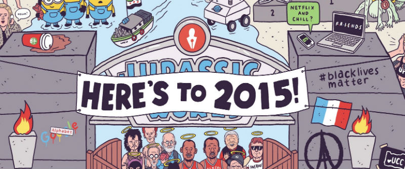 На своей иллюстрации художник уделил особое внимание ключевым событиям в мировой культуре, спорте, шоу-бизнесе, политике, подчеркнул самые популярные фильмы 2015 года. Корпорация Google создала новую компанию Alphabet; теракты в Париже и стрельба в колледже Ампква; The Weeknd на вершине мировых хит-парадов; американская анимационная комедия «Миньоны»; марсоход обнаружил воду на Марсе; новый альбом певицы Адель, после 3-летнего перерыва; Леброн Джейм выигрывает чемпионат NBA; персонажи из фильмов «50 оттенков серого» и «Парк Юрского периода»; конечно же, новые «Звездные войны»; легализация однополых браков и смертельное землетрясение в Непале.