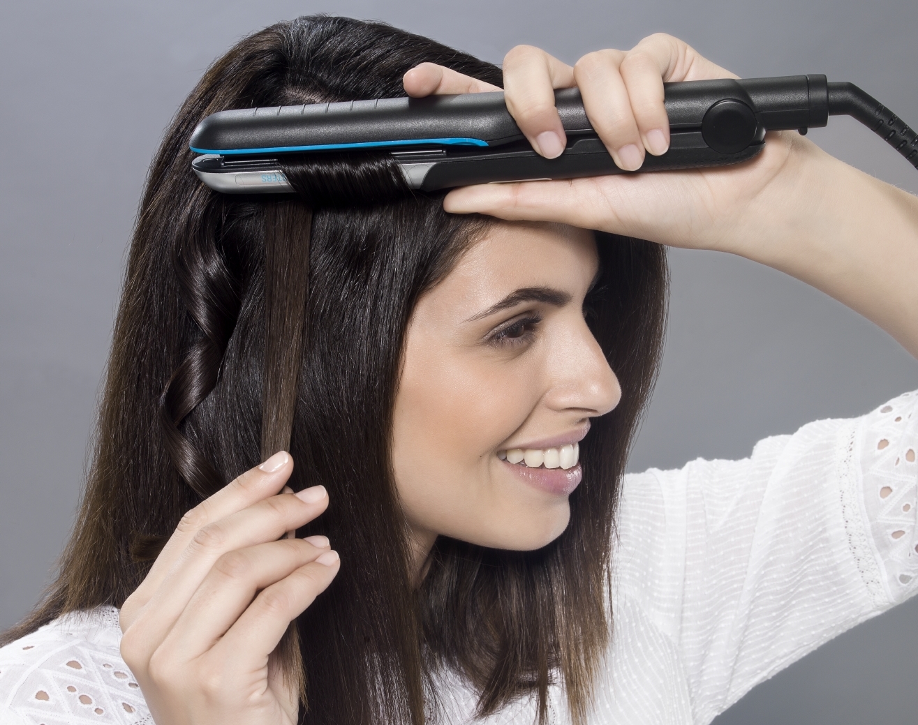 Благодаря скруглённой форме плавающих пластин стайлер легко совмещает функции выпрямителя и плойки. В одном положении он выравнивает волосы, а в другом ― завивает их в безупречные локоны. Всего один поворот руки, и ты уложишь ровные, сияющие шелковым блеском пряди, сделаешь голливудские волны, романтичные завитки, легко создашь объём.