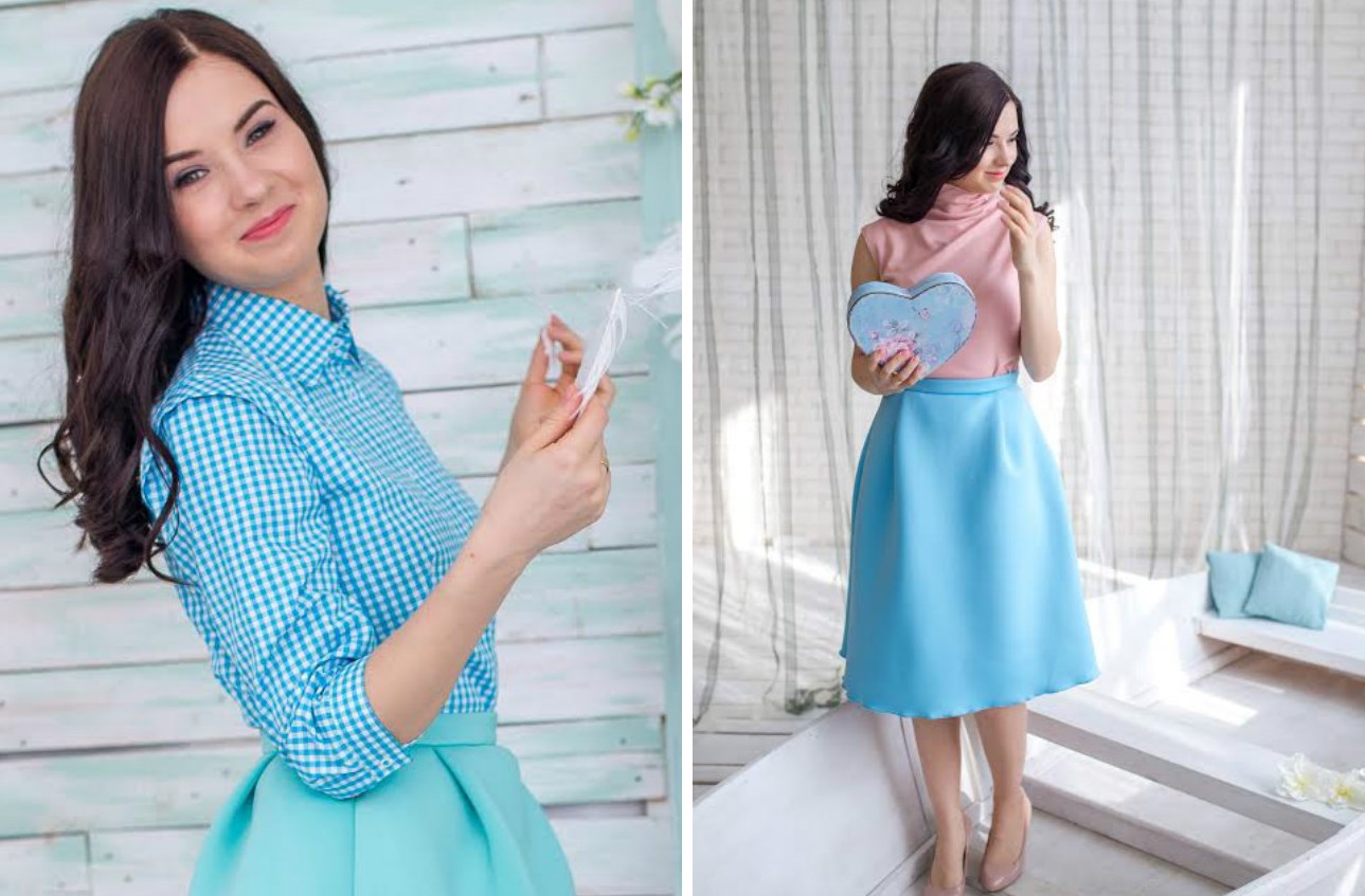 Для рубашек конечно натуральные ткани: хлопок, котон, штапель. Одежда, которая прилегает должна помогать дышать телу, а не наоборот. Водолазки из вискозы. А вот в весенних юбках мы позволили использовать неопрен. Ну какая ткань ещё удержит форму? Юбка не прилегающая, синтетика позволительна во благо форме.