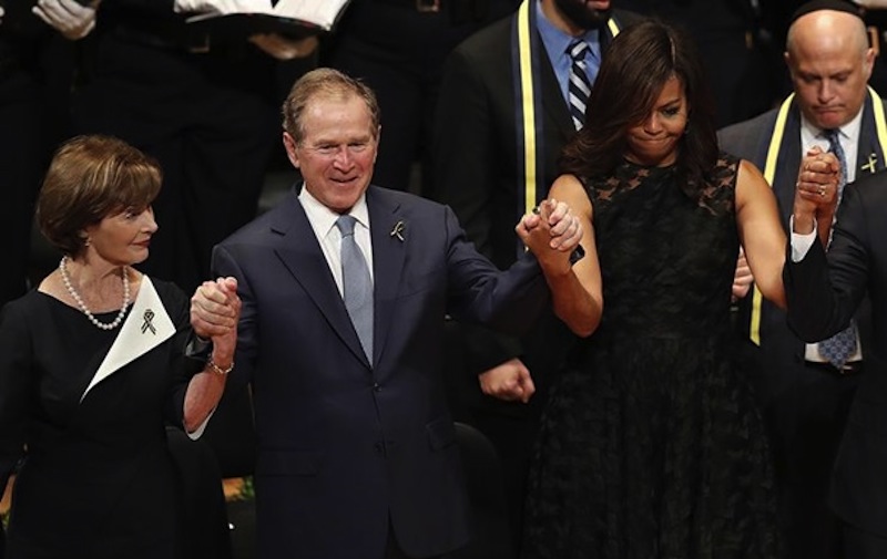 На днях состоялась траурная служба в память о погибших полицейских которые стали жертвами снайпера в Далласе. Панихида прошла на официальном уровне, множество политиков как действующих так и отставных присоединились к церемонии. Джордж Буш-младший также не пропустил мероприятие. Именно он и стал "звездой" вечера, как бы нелепо это не звучало. Во время исполнения "Боевого гимна Республики" Буш пошел в пляс. Это конечно не первый раз когда экс-президент демонстрирует свои танцевальные па и старается поднять окружающим настроение, но в этом случае его старания были раскритикованы в социальных сетях.