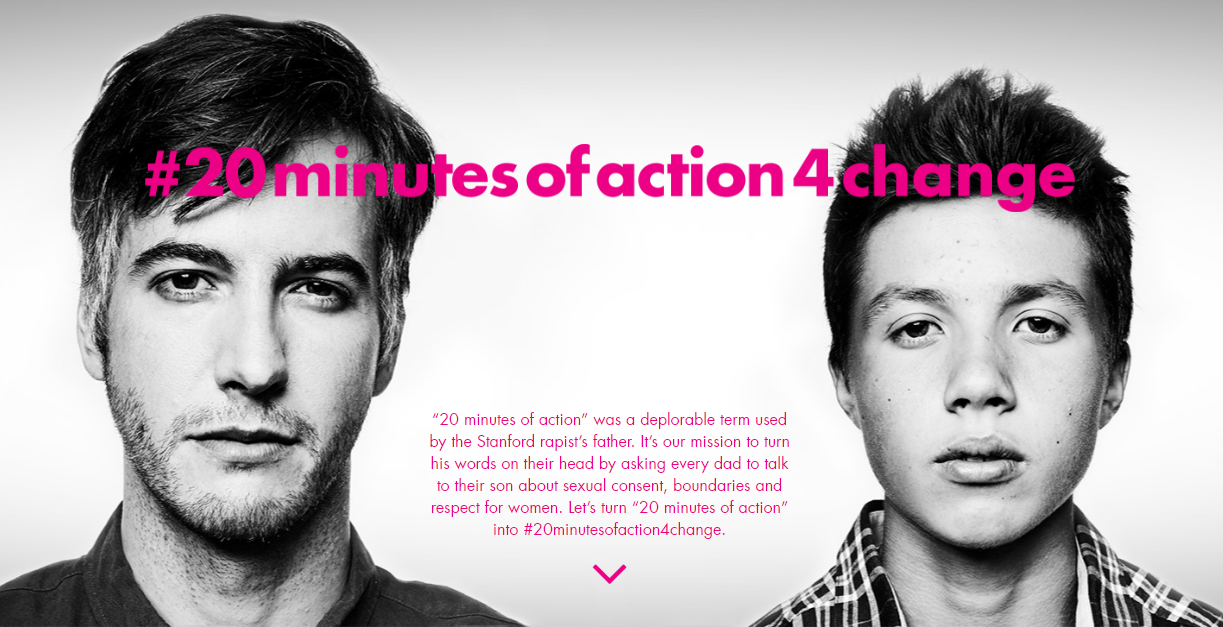 Акция зародилась как ответ на слова отца "стэнфордского насильника" Брока Аллена Тернера, который изнасиловал девушку без сознания и не понес за это ответственности. Тогда на суде его отец сказал, что тюремное заключение - это слишком большое наказание за "20-минутный проступок". Так этот человек назвал изнасилование. Мужчины по всему миру решили доказать, что 20 минут можно потратить на кое-что гораздо более полезное. Например, на разговоры с сыновьями и объяснение им базовых принципов человеческих отношений.