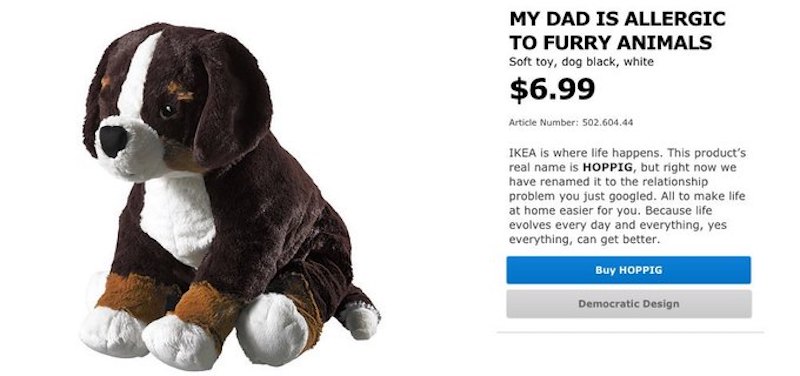 Названия товаров IKEA всегда отличались странностью. Но вызвано это было скорее сложностью шведского языка - компания раньше использовала названия шведских городов, сел и рек, а звучали они довольно странно. Сейчас же креативный отдел компании решил пойти дальше - сейчас товары называются так, как и самые популярные запросы Google. Звучат такие названия не так смешно, как грустно. Чего только стоит микроволновка «Моя мама не умеет готовить» или костюм королевы «Моя семья меня не уважает».