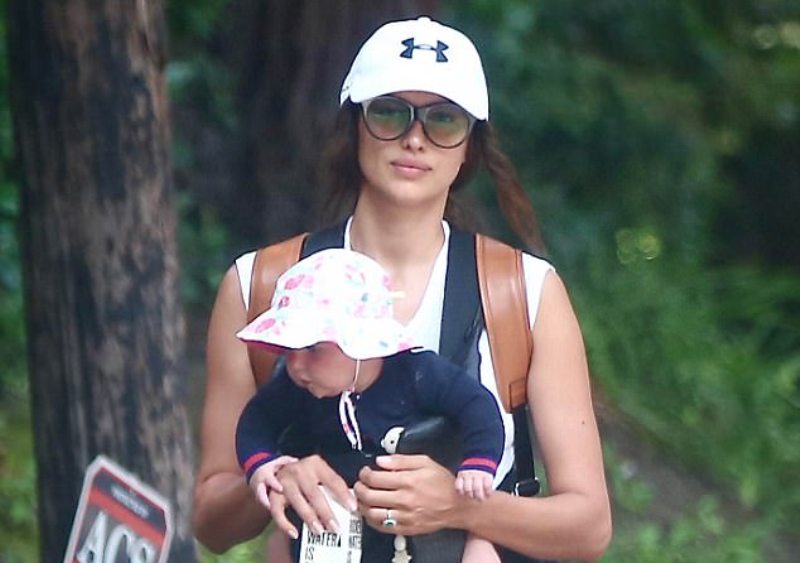 Для прогулки Ирина выбрала комфортный наряд: спортивные лосины, майка, белые кеды и рюкзак, и в соответствующей цветовой гамме одела дочь. На малышке был темно-синий боди с красными манжетами и белые носочки, а из-под полей панамки торчали потешные младенческие щечки. На кого больше похожа кроха рассмотреть не удалось, но судя по всему, это не последняя их прогулка, так как Ирина даже не пыталасьприкрыть лицо малышки.