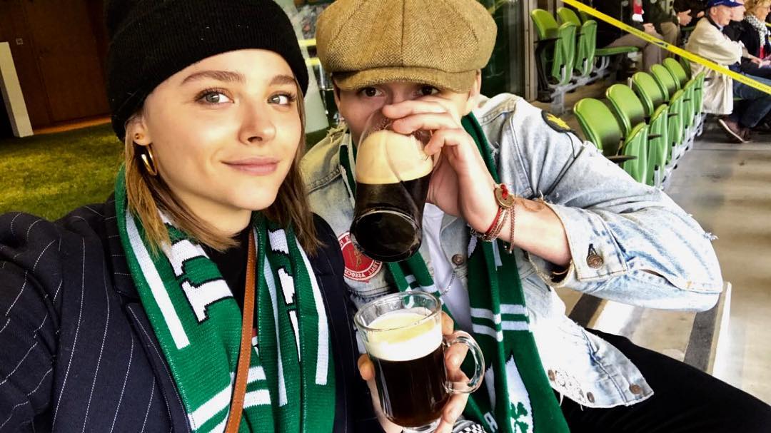 В отношениях между 20-летней Хлоей Морец и 18-летним Бруклином Бекхэмом новый виток – влюбленные снова наслаждаются компанией друг дуга. Об этом свидетельствует недавняя публикация сделанная актрисой в Instagram. Хлоя поделилась роликом, на котором Бруклин целует ее в щеку, а также, несколькими кадрами, сделанными на ирландском стадионе Aviva во время одного из матчей.