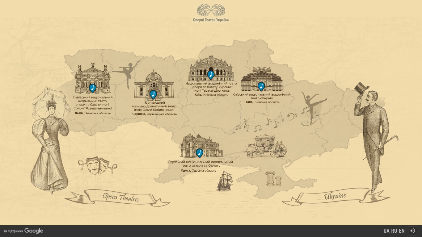«Google Украина» в сотрудничестве с Министерством культуры Украины оцифровали пять театров в разных городах нашей страны. Специально созданный сайт позволяет совершить виртуальное путешествие в любой из предложенных театров, узнать его историю, насладиться уникальной архитектурой и даже побывать в местах, которые обычно закрыты для посетителей.