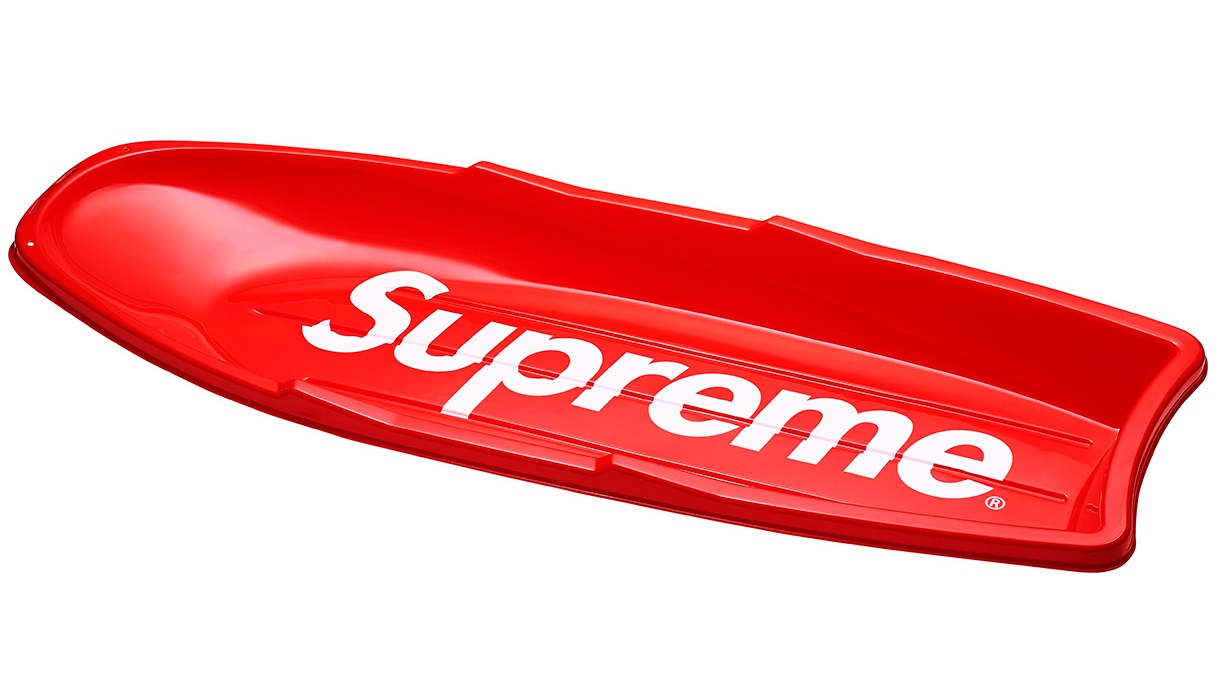 Несмотря на то, что до оконца года осталось совсем ничего и большинство подарков уже куплены, Supreme успевает догнать последний вагон. Накануне бренд выпустил лимитированную серию санок алого цвета с заметным логотипом, которые не дадут потеряться даже при самой большой загруженности склона.