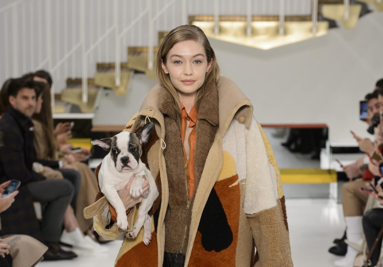 Чем руководствуются дизайнеры, выпуская на подиум щенков – непонятно, ведь существует огромная вероятность того, что внимание зрителей полностью будет отдано щенкам, а не деталям коллекции. А если взглянуть на выражение мордочки бульдога, которого несла Джиджи Хадид, то становится сразу понятно, кто стал звездой шоу.