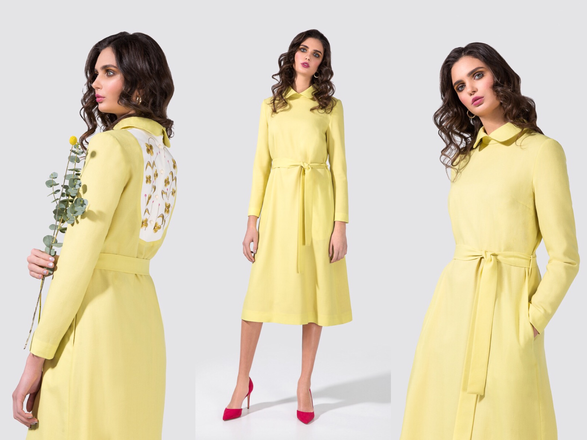 Главный акцент сделан на классических платьях длины миди. На спинке сделаны вставки с вышивкой гладью на светлом фоне, нитями в тон основной ткани. Модели представлены в розовом и лимонном оттенках. Три модели с разной формой рукава – от свободного прямого до широкого и присборенного на манжет.