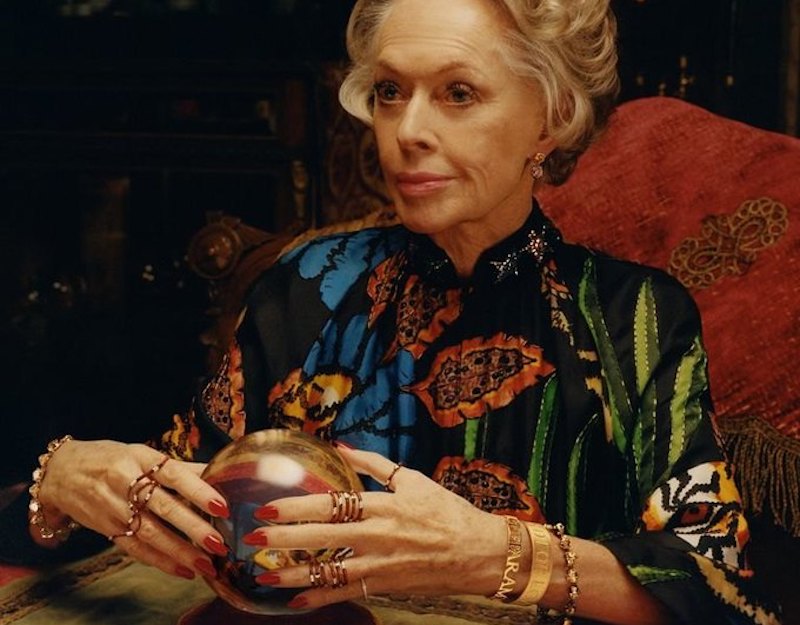В рекламе 88-летняя Типпи с идеальной прической и маникюром играет роль гадалки. Руки женщины украшены кольцами и браслетами из новой коллекции Gucci.