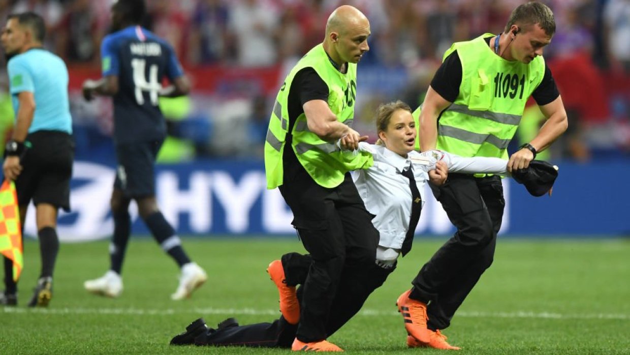 На 50-й минуте матча Франция-Ховатия четверо участников Pussy Riot выбежали на поле в костюмах полицейских. Матч пришлось срочно остановить.