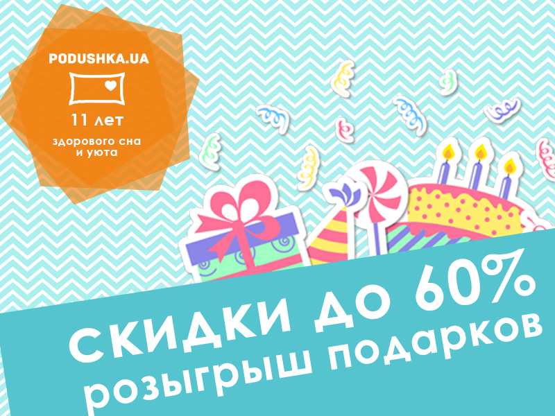 В честь своего 11-летия Podushka.ua будет делиться со всеми своим праздничным настроением: скидками до 60% и ежедневным розыгрышем подарков в период с 23-27.07.2018. Весь день 27 июля по специальному промокоду Podushka_Birthday_11 можно будет получить скидку 11% на любой товар.
