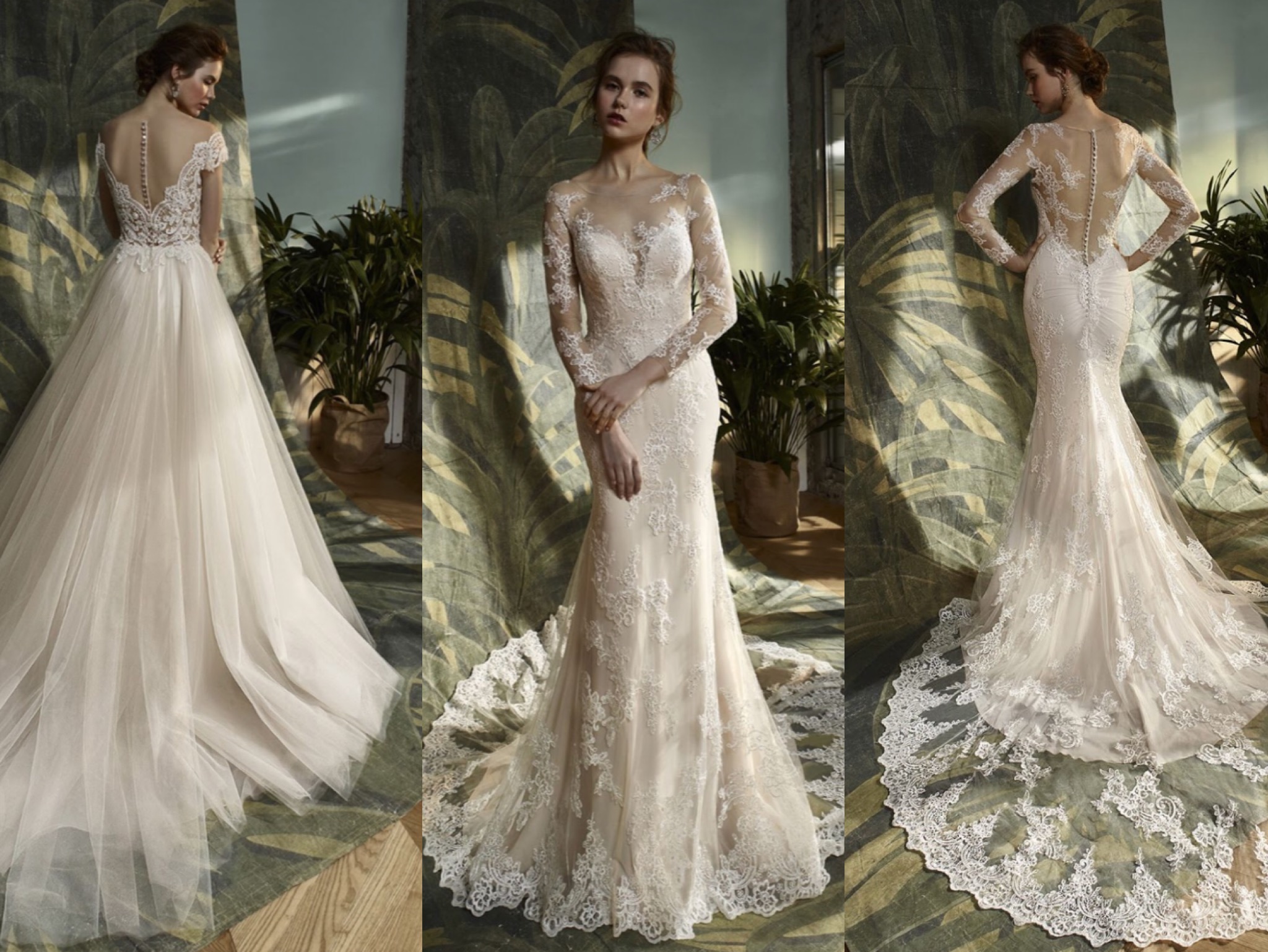 Заметный ряд мелких пуговиц, в идеале обтянутых шелком, сегодня - must have. И речь не только о повседневном гардеробе, нововведения касаются самых торжественных нарядов. Изящный силуэт фигуры будет идеально подчеркнут таким декором на спинке. Бренд Enzoani использует глянцевые пуговицы на совсем прозрачных фатиновых вставках, а вот Rosa Clara больше использует плотную основу из кружева, на котором пуговицы менее заметны, но от этого не теряют своего романтического настроения.