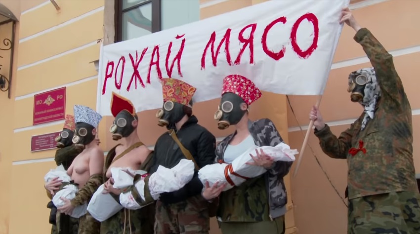 23 февраля у стен одного из военкоматов Санкт-Петербурга активистки провели импровизированную акцию против службы в армии и военной политики России. Женщины были одеты в военную форму, противоназы и кокошники, а в руках держали свертки, на первый взгляд напоминающие младенцев, укутанных в пеленку. Свертки были перевязаны георгиевскими лентами, а внутри вместо младенцев было сырое мясо. Именно так, по мнению активисток, российское правительство воспринимает своих граждан.