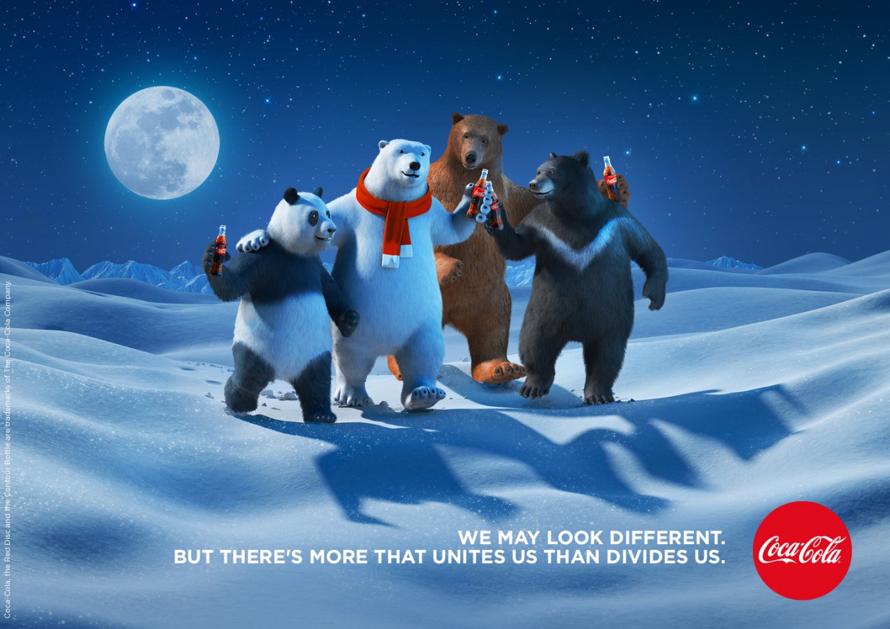 В течение почти 100 лет белый медведь был лицом многих зимних рекламных кампаний Coca-Cola. Компанию белым медведям составляли лишь белые медведи, но на днях ситуация изменилась. Новая реклама стала символом разнообразия и единства.