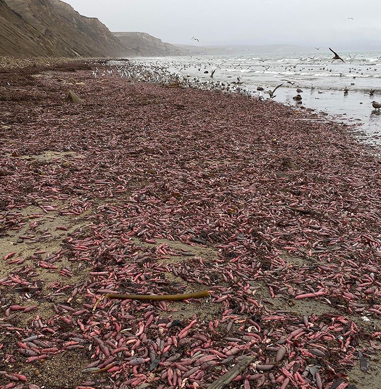 На пляж в Калифорнии вынесло тысячи морских из-за нескольких сильных штормов, произошедших в регионе. Черви, которых по понятной причине в народе называют "рыбой-пенисом", живут под слоем песка. Существа относятся к эхиуридам – подклассу многощетинковых морских червей, который существует на планете уже 300 миллионов лет. Продолжительность жизни червей составляет 25 лет – это очень долго для беспозвоночных.