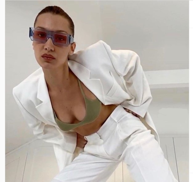 Съемка доказывает, что хиты инстаграма — вроде трикотажных бра и микросумок — можно успешно носить и дома. Хадид позирует в вещах из весенне-летней коллекции: белоснежных брючных костюмах, трикотажных боди, а также с сумкой Le Grand Chiquito.
