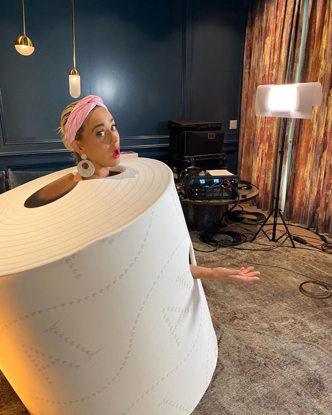 Певица Кэти Перри, судья на шоу American Idol, не перестает удивлять зрителей своими образами. Ранее она появилась в костюме огромной банки санитайзера, а теперь оделась рулоном туалетной бумаги. Снимками своего карантинного костюма певица поделилась в инстаграме, уточнив, что он не из настоящей туалетной бумаги.