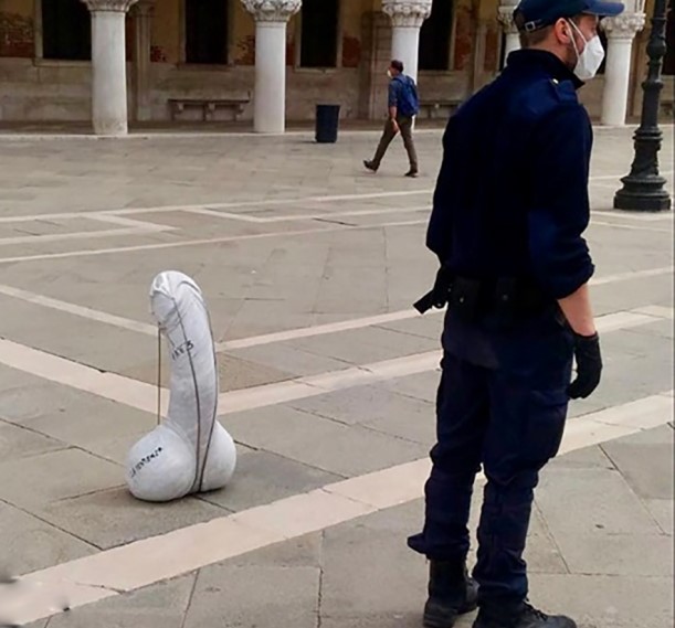 На площади Сан-Марко в Венеции появился метровый бетонный пенис в медицинской маске, удерживаемый стальными тросами. Фотографии скульптуры выложили в группе “Венеция — не Диснейленд” на фейсбуке, где регулярно публикуют местные новости.