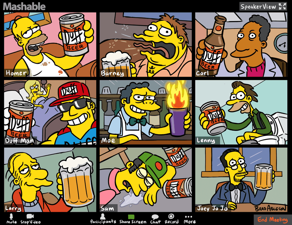 Первый фон — изображение Zoom-звонка между 9-ю персонажами, включая Гомера, Мо, Барни, Ленни, Карла и других.