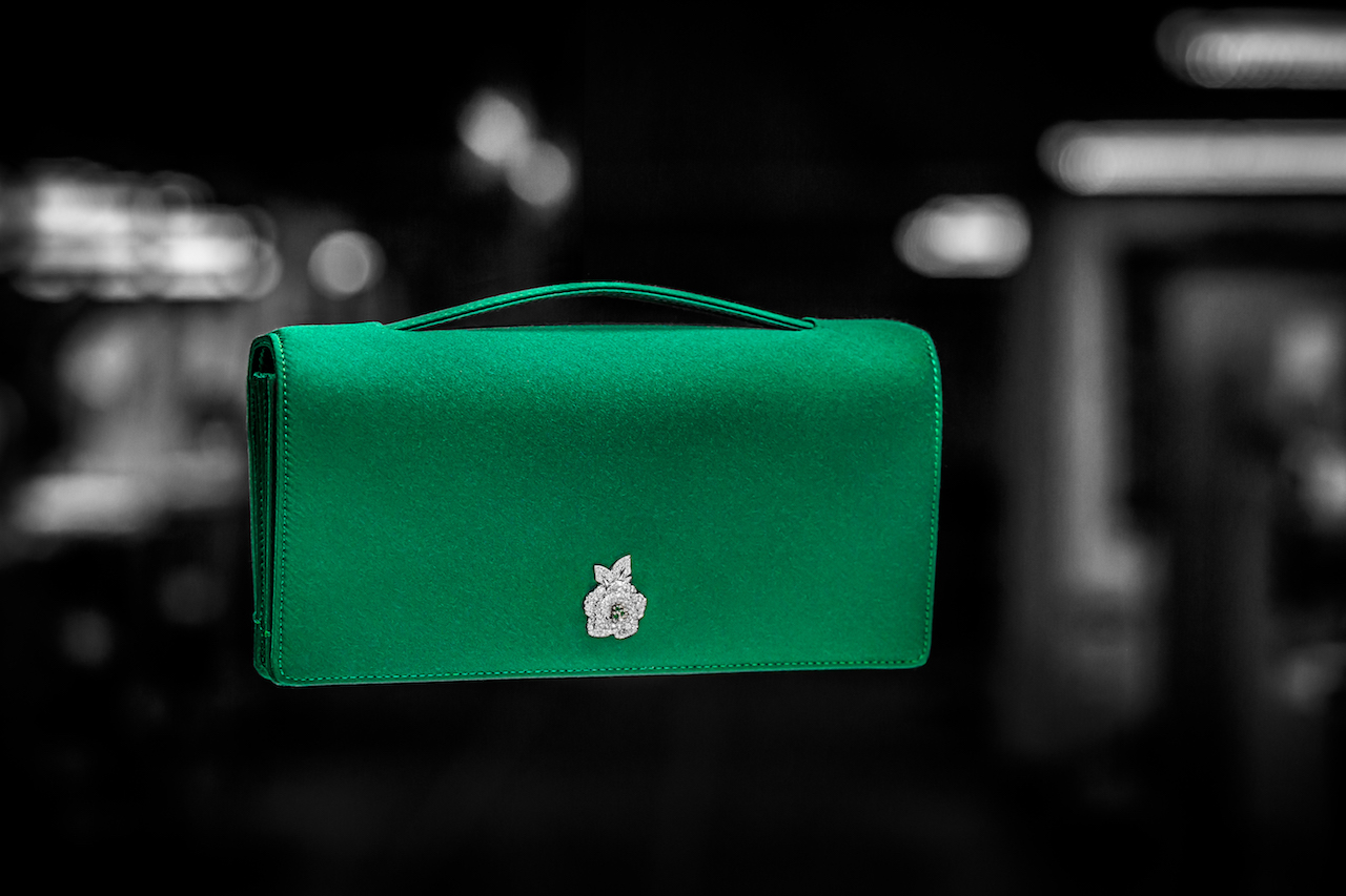 Клатч отделан атласной тканью. Его украшает драгоценная роза из бриллиантов и изумрудов - Rose Dior Bagatelle. Цветок выбрали неслучайно — основатель модного дома обожал розы и выращивал их у себя в саду.