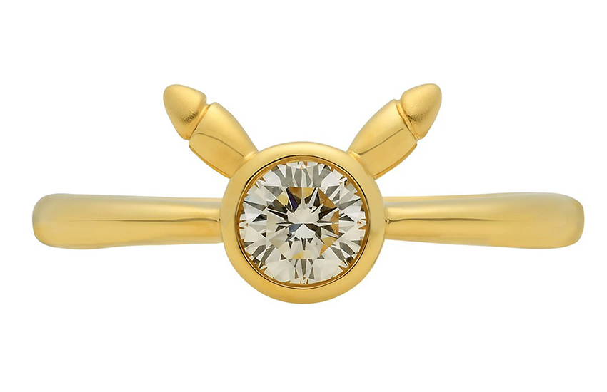 Самое скромное кольцо декорировано контуром головы Пикачу и маленьким бриллиантом. У второго драгоценный камень в 3 карата обрамлен забавными ушками Пикачу. А у третьего точно такой же камень расположен двумя «хвостами». Вторая и третья модель доступны в разных вариантах: из желтого и белого золота.