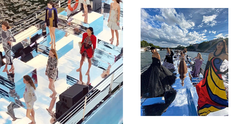 Модный дом Balmain представил коллекцию Haute Couture осень/зима — 2020/2021. Подиумом стала речная баржа, на которой 44 модели отправились по воде от Эйфелевой башни до собора Нотр-Дам. Кроме платьев из кутюрной коллекции, модели носили архивную одежду, созданную самим Пьером Бальманом, основателем бренда. Появились и наряды, созданные его последователями Эриком Мортенсеном и Оскаром де ла Рентой. По словам Оливье Рустена, нынешнего креативного директора Balmain, так он хотел познакомить зрителей с историей модного дома. В этом году Balmain празднует 75-летие.