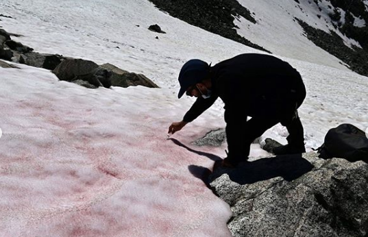 Во время исследования ледника Презена в Итальянских Альпах, ученые обнаружили необычное явление – розовый снег. Эксперты связывают это с глобальным потеплением.