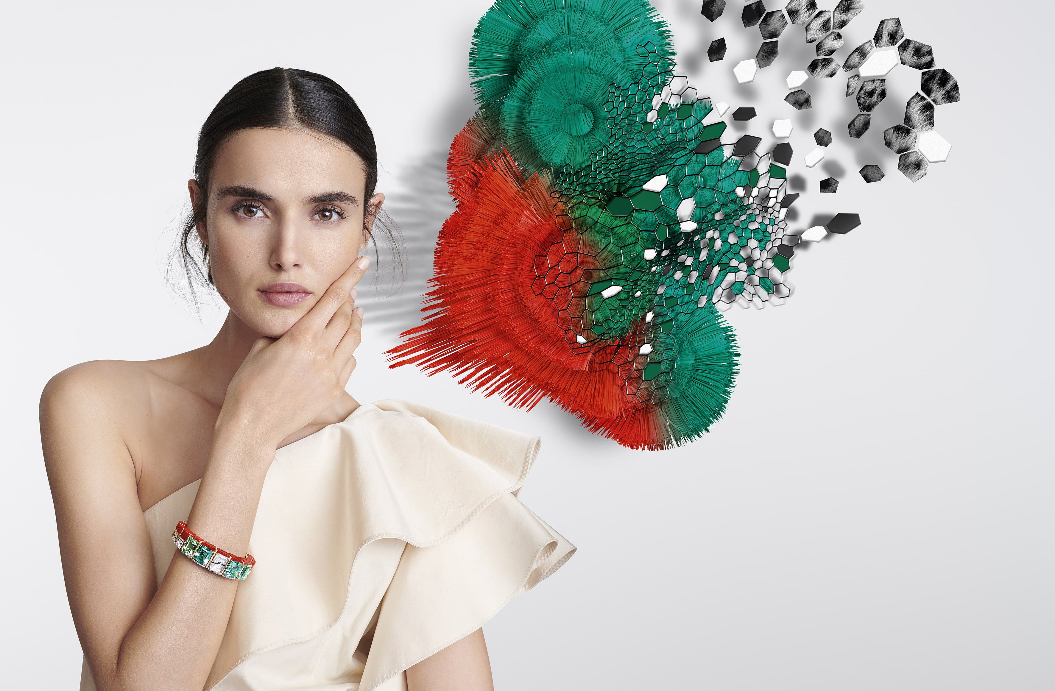 В колье Gharial, которое отсылает к названию крокодила, гангского гавиала, чередование бриллиантов и изумрудов имитирует рисунок кожи этих пресмыкающихся.