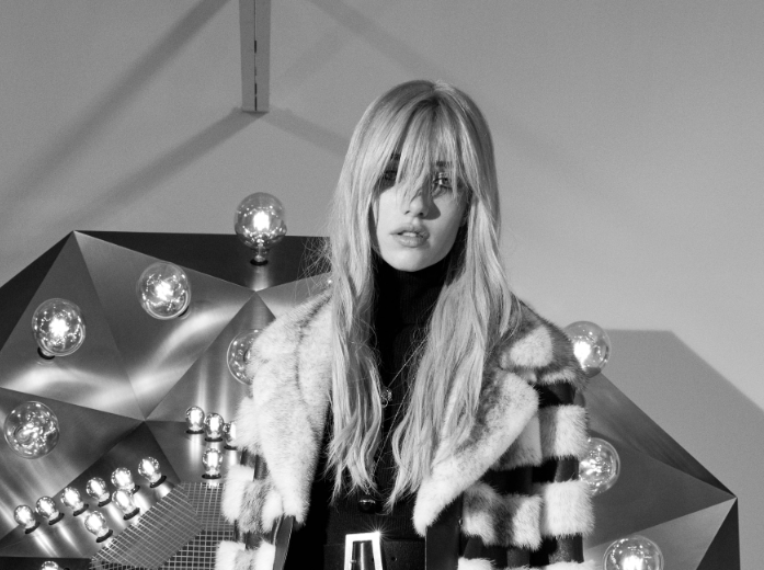 Модель позировала Юргену Теллеру в вещах из осенне-зимней коллекции бренда: бархатном черном костюме, блестящей блузе, шортах, ботфортах.