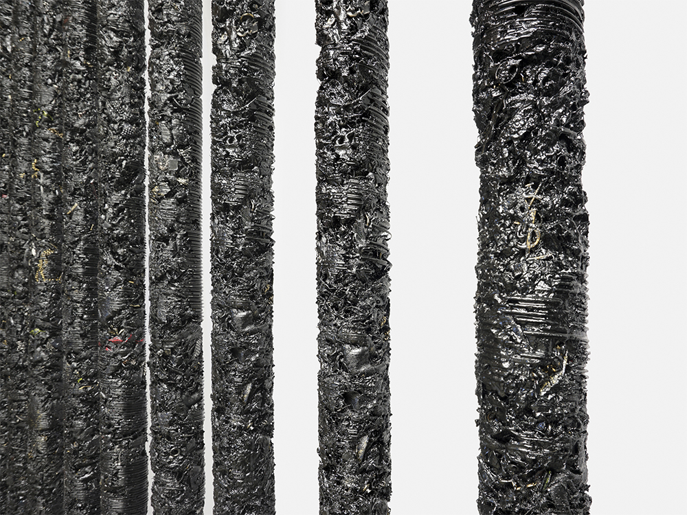 Ланг измельчил прототипы аксессуаров, непроданную одежду и украшения, смешав их с пигментированной смолой. На поверхности проглядываются золотые цепи и текстура тканей. По словам бренда, работы объединяют “ценность прошлого и многообещающее будущее”.