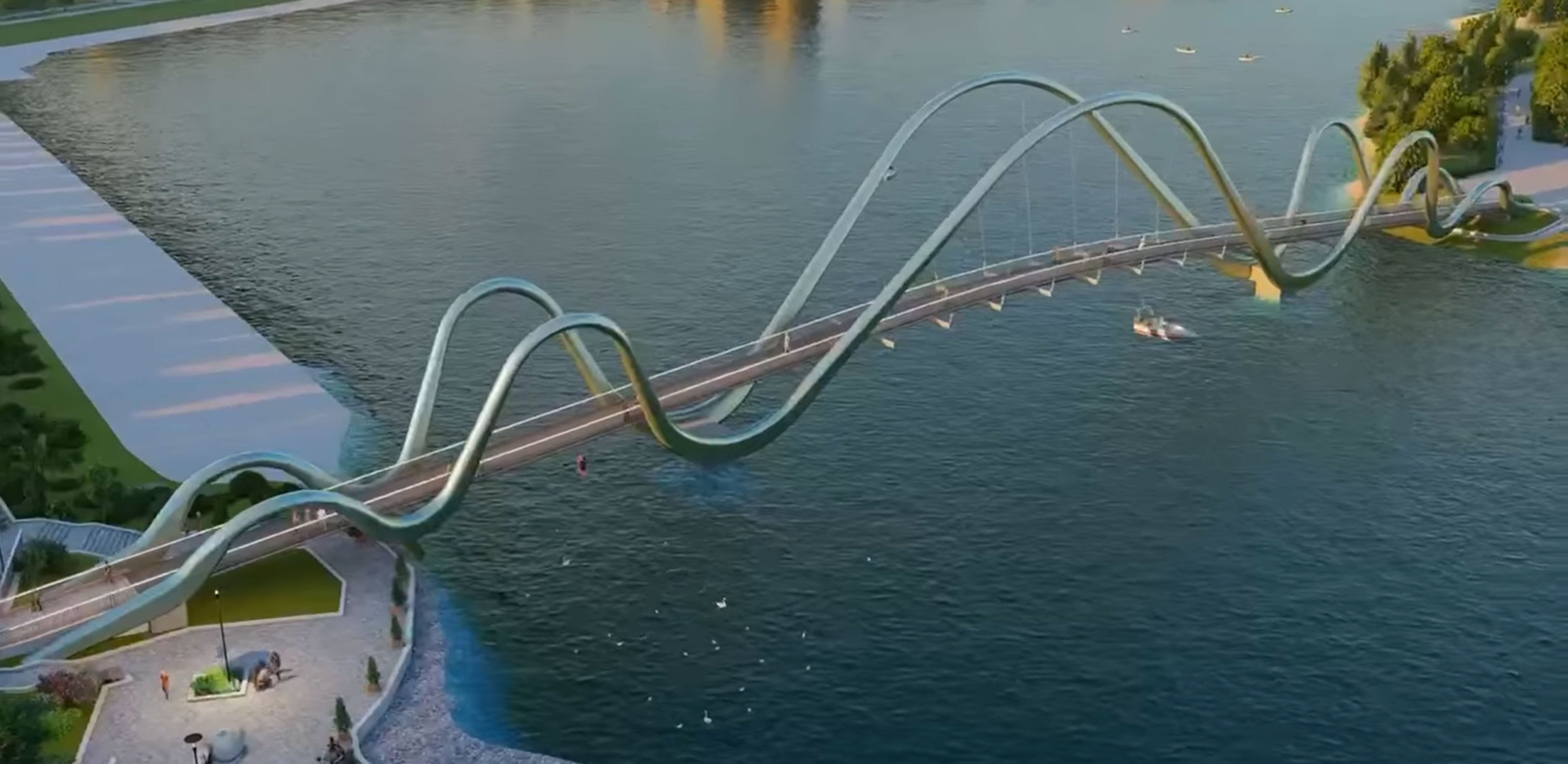 Мост будет длиной 130-140 метров. У него будет динамическая подсветка, а железные волны — это его несущие конструкции.