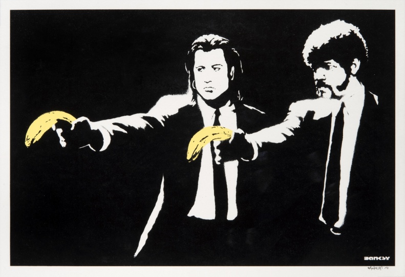 Недавно ушел с молотка еще один шедевр художника – пародия на сцену из "Криминального чтива" Тарантино. Вработе Бэнкси Джон Траволта и Сэмюэль Л. Джексон держат бананы вместо пистолетов.