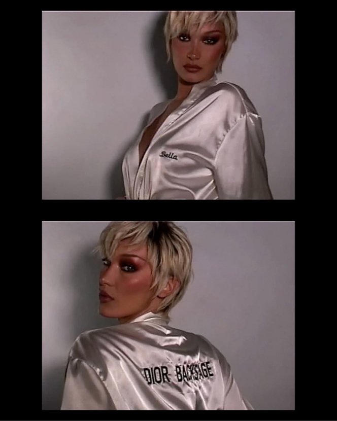 “Лицо Беллы напоминает мне иллюстрации 1980-х, где изображены женщины с невероятным макияжем”, — говорит он. Основным цветом макияжа стал розовый. Для губ Сэм использовал бальзам Rouge Dior Satin Lip Balm и помаду Rouge Dior 414 в цвете Saint Germain, а также карандаш Dior Contour 532 коричневого оттенка Jungle Brown. Тени повторяли приглушенно-розовую палитру.