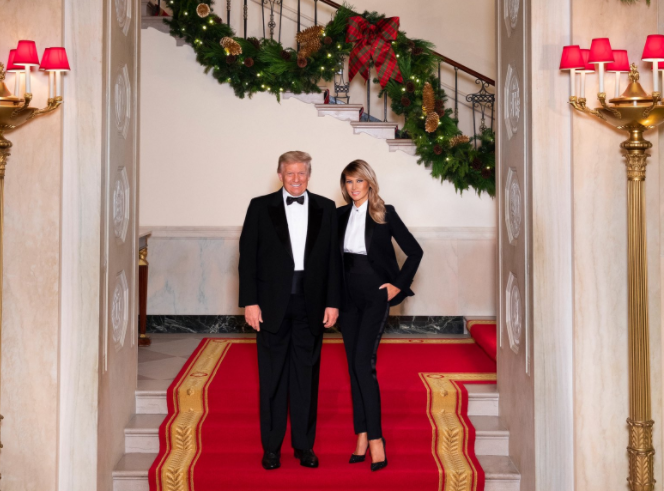 Президент США Дональд Трамп и первая леди Мелания опубликовали последний рождественский портрет из Белого дома. На снимке пара позирует на украшенной к праздникам парадной лестнице резиденции в похожих нарядах: белых классических рубашках и черных смокингах. При этом Дональд дополнил свой образ черным галстуком-бабочкой, а Мелания — классическими туфлями-лодочками на каблуке.