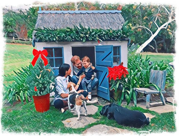 Меган Маркл и принц Гарри выпустили рождественскую открытку. Изображением поделился приют для бездомных животных Mayhew в Великобритании. На иллюстрации изображены Меган, Гарри и их сын Арчи с двумя псами, Гаем и Пулой.