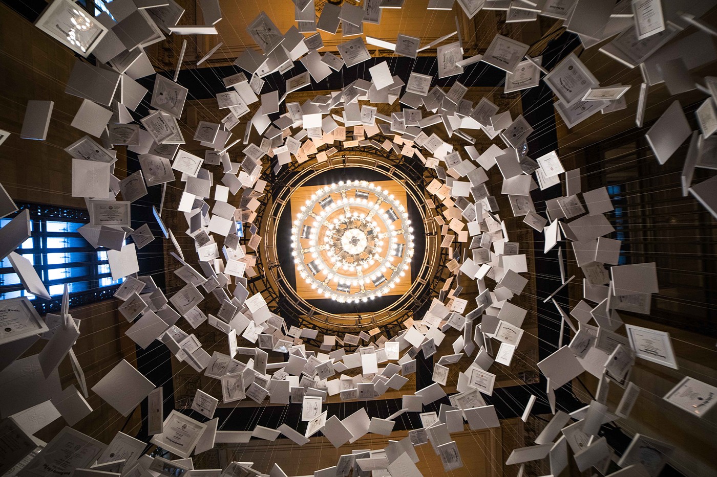 Произведение представляет собой каскадную инсталляцию из 2 600 настоящих дипломов, которые примерно оцениваются около $ 180 000 каждый, — средняя стоимость 4-летнего обучения в колледже в США. Таким образом, вся инсталляция оценивается в $ 470 миллионов. Это всего на $ 20 миллионов дороже самой дорогой картины из когда-либо проданных — "Спаситель мира" Леонардо да Винчи.