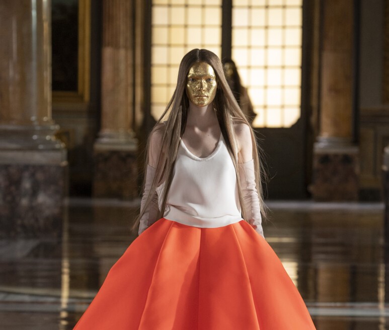 Лица моделей женщин покрывали уже знакомые поклонникам золотые маски. Среди вечерних платьев безупречных силуэтов появились также резной кейп, просторные пальто и непривычно минималистичные наряды с юбками миди. Одним из самых зрелищных образов шоу стало золотое свадебное платье.