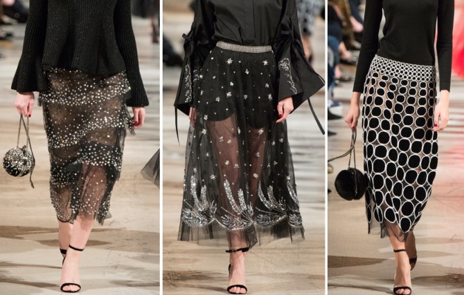 Крупные переплетения нитей, иногда дополненные бусинами, жемчугом и другим декором, выступают как элемент одежды. Однако, сетку можно эффектно носить как поверх вечернего минималистичного платья, так и с базовой футболкой и джинсами. Юбку из сетки важно сбалансировать более спокойным верхом. Например, это может быть удлиненный пиджак.