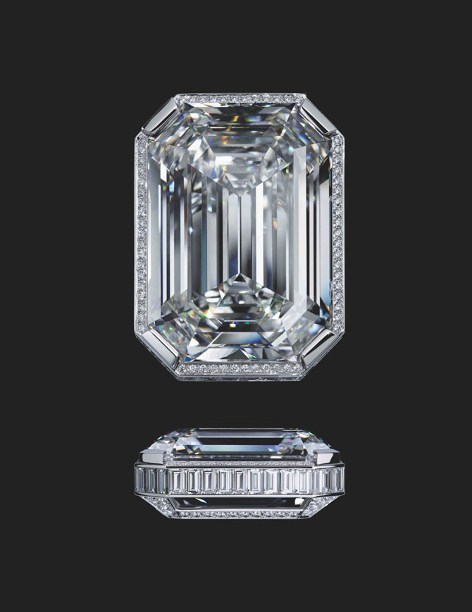 Необработанный алмаз весом 55,55 карата огранили до идеальной восьмиугольной формы. Он окружен 104 бриллиантами круглой огранки и 42 бриллиантами багетной огранки.