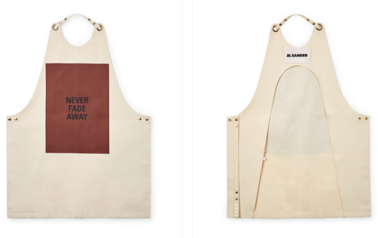 Фартуки выполнены из неокрашенного натурального хлопка чистого бежевого оттенка. Их украшают мотивирующие надписи Blue Window Behind The Stars (“Синее окно за звездами”), The Sun Always Rises (“Солнце всегда встает”) и Never Fade Away (“Никогда не угасай”).