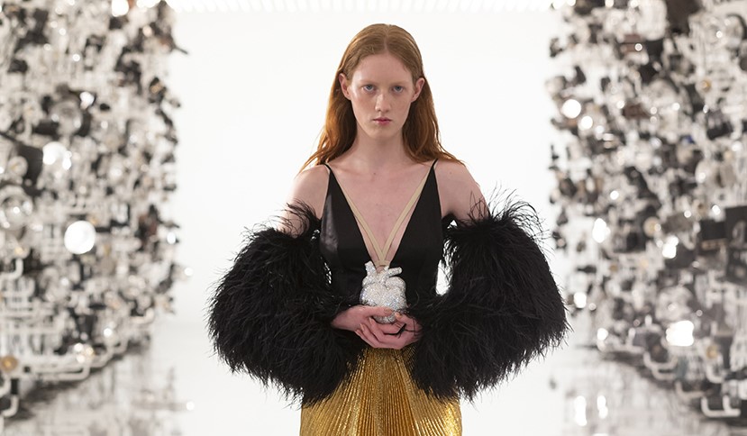 Геометричные жакеты, платья и плащи украшали психоделические принты родом из гламурных 70-х, а поверх некоторых нарядов Микеле наслоил красно-зеленые ленты, которыми до сих пор узнаваем дом. В видео модели начинают обнимать и целовать друг друга в какой-то момент, и становится очевидно, что взаимные чувства, пленившие два модных дома, нашли отражение в неоднозначном, но очень эффектном слиянии. Линию аксессуаров, кроме легендарных сумок и украшений, дополнили объемные анатомические сердца, усыпанные кристаллами.