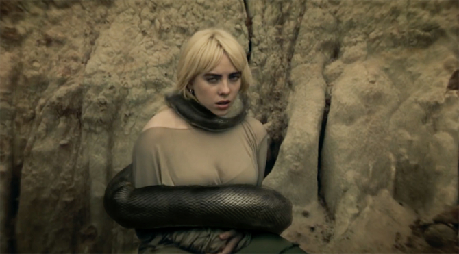Билли Айлиш выпустила третий сингл из грядущей пластинки Happier Than Ever и клип на него. Ролик снят с дрона. На видео певица оказывается в горах в компании гигантского удава, который буквально душит ее в “объятиях”. Под акустическую гитару она поет “Постарайся не злоупотреблять своей властью, я знаю, что мы не хотели меняться…”.