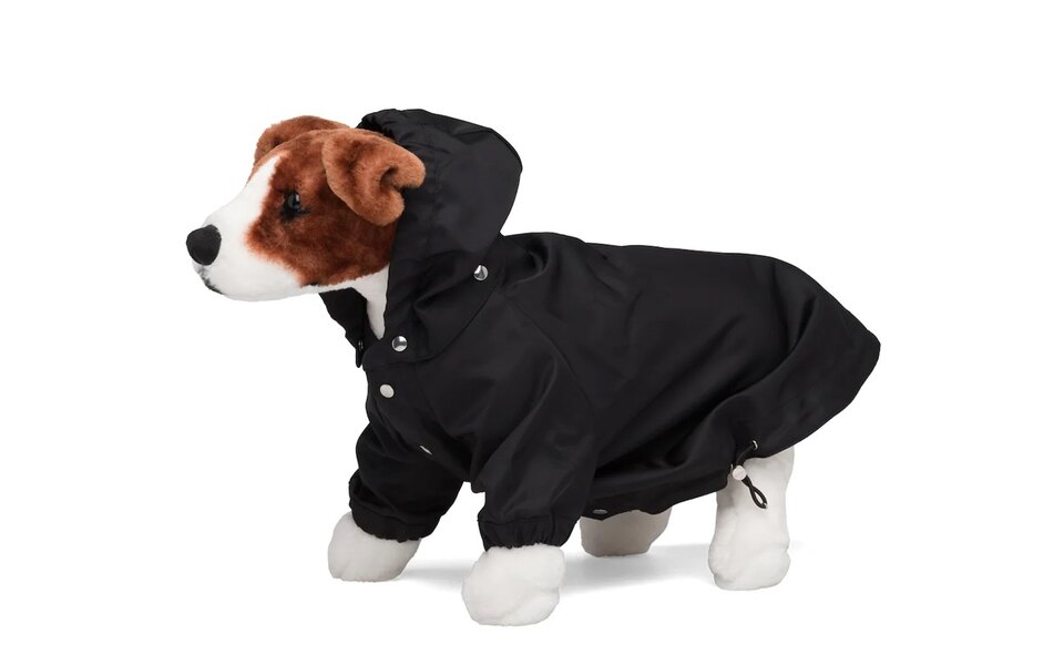 У черного дождевика есть съемный капюшон и логотип Prada на спине. Плащ всего 24 см в ширину и 42 см в высоту — он рассчитан на небольших собак.