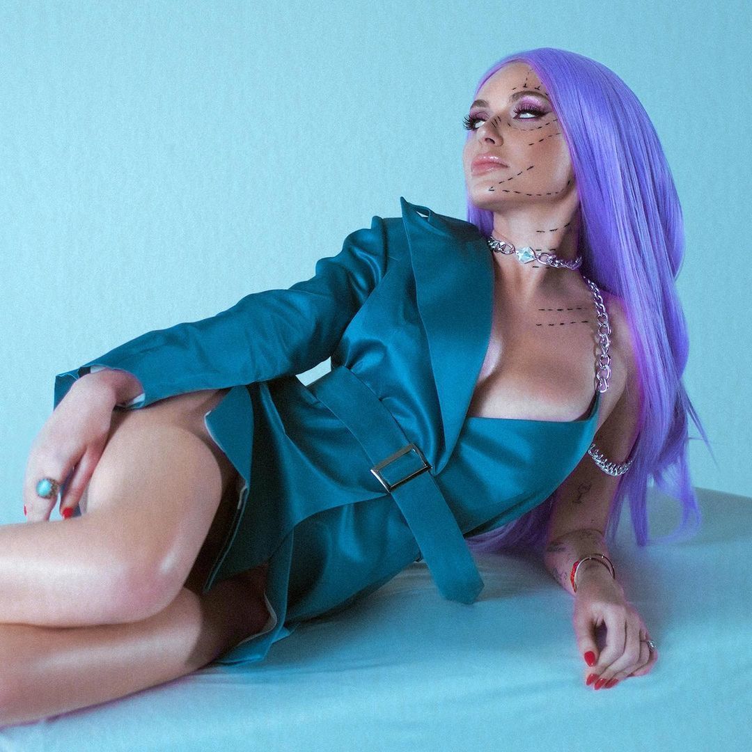 На странице в инстаграме знаменитость, которая начала сольную карьеру, поделилась эффектным кадром, скорее всего, со съемок клипа. На фотографии Слава позировала лежа на полу в откровенном зеленом платье и с лиловым волосами. Исполнительница похвасталась пышной грудью.