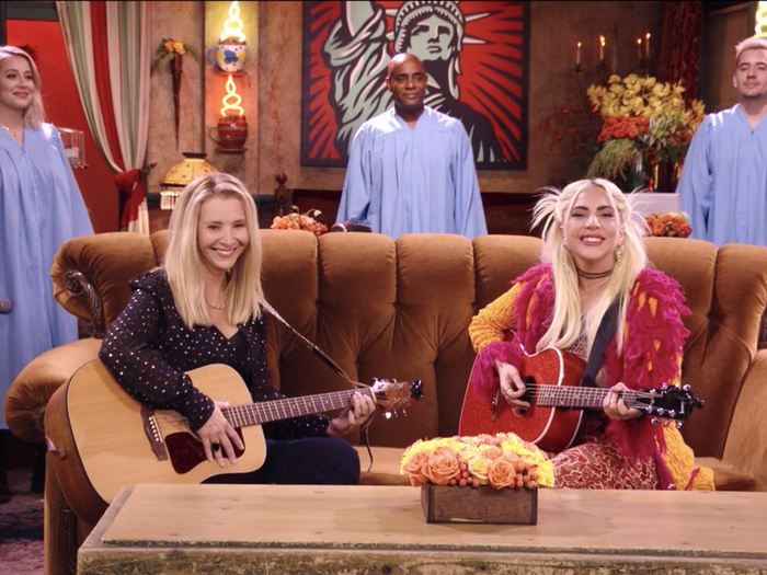 В спецвыпуске Леди Гаге досталась привычная для нее роль - певицы. Звезда исполнила песню о драном коте вместе с Лизой Кудроу.