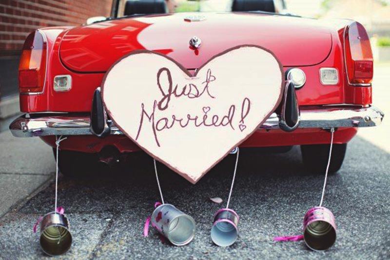 Сегодня есть много альтернатив, которыми можно заменить жестяные банки - металлические предметы (вилки и ложки), воздушные шары, заполненные гелием, бумажные цветы, помпоны и гирлянды из сердечек, колец и прочей атрибутики. Все закрепляется на надежную прочную веревку и цепляется к бамперу автомобиля. Во время движения такой декор задает активный ритм движения, фееричность и сразу становится ясно, что едут молодожены, у которых сегодня один из самых чудесных дней в жизни.
