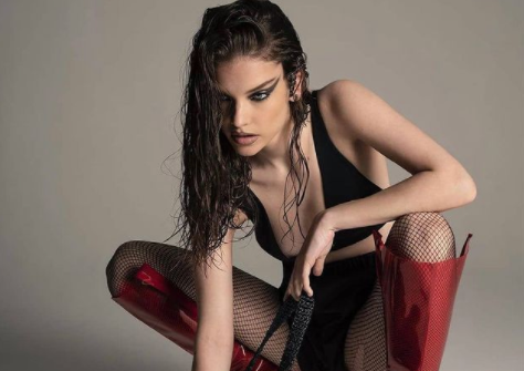 Для съемки модель примерила откровенные образы. Она позировала в черном кружевном комбинезоне, с авоськой от Prada, в ботфортах в сетку и красных ботфортах из винила, в лаковом тренче и в других смелых луках.