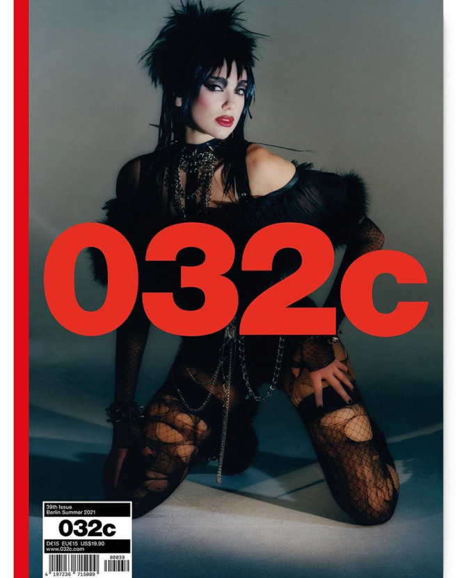 Певица Дуа Липа стала героиней обложки летнего выпуска 032c. Над образом певицы работал Марк Геринг, стилист и фэшн-директор немецкого журнала. Она появилась в черной шубе, колготках из кружев и чокере из массивных цепей.